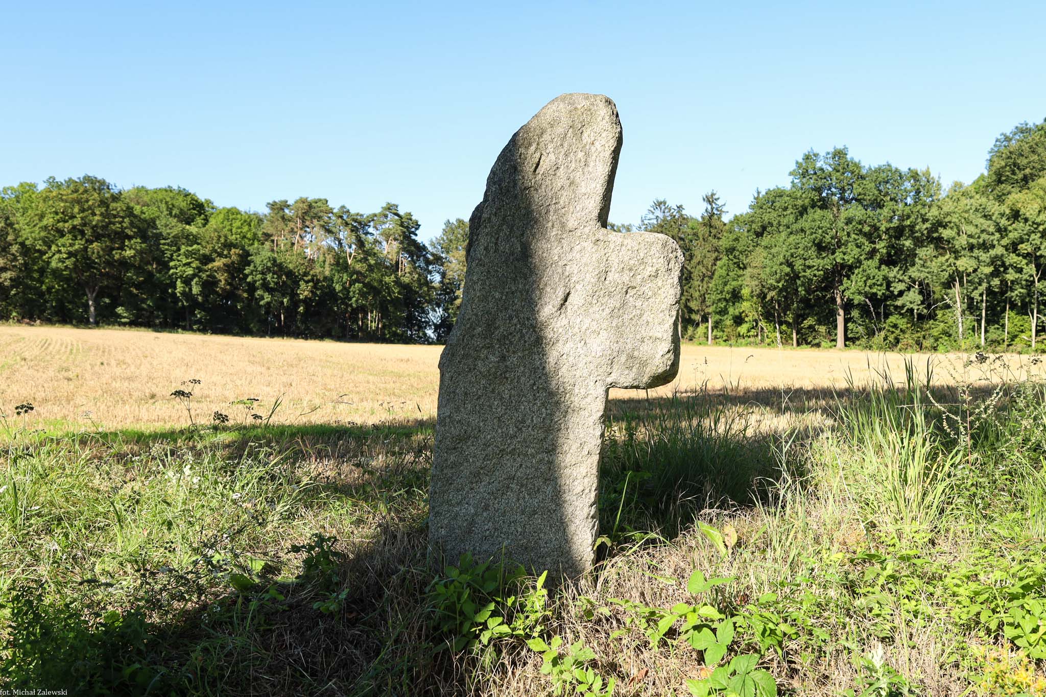 Granitowy krzyż na rozwidleniu drogi do wsi i głównej drogi do Żarowa (strona NE), 50°58'18.9"N 16°29'53.6"E. Brak ramienia.