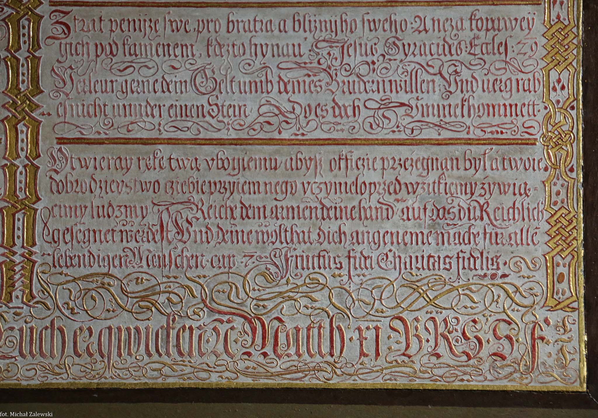 Tablica z inskrypcją zawierająca prośby o jałmużnę w 12 językach. Fot. 2023. Południowa kruchta fary elżbietańskiej. Fragment w języku polskim.