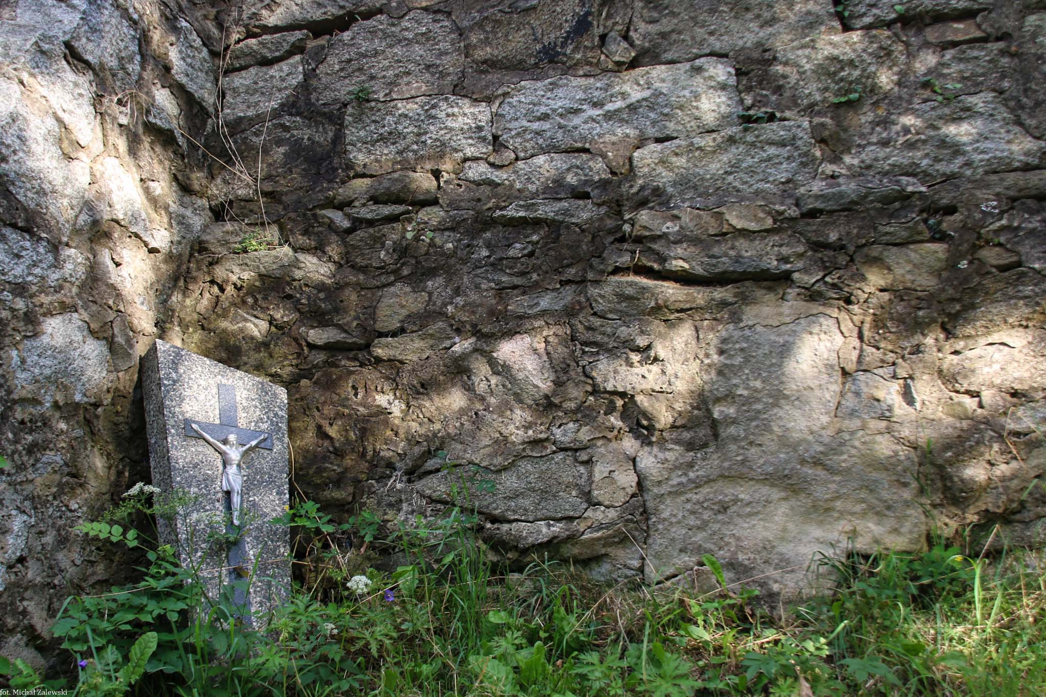 Piaskowcowy krzyż wmurowany po zewnętrznej stronie muru cmentarza kościelnego kościoła św. św. Piotra i Pawła pomiędzy 4. a 5. przyporą. 50°59'24.7"N 16°27'48.9"E.
