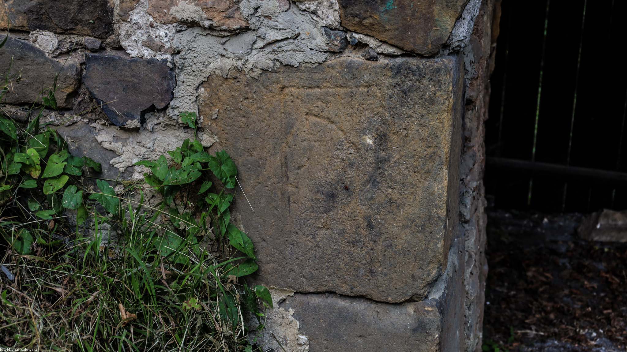 Brama od wewnątrz na cmentarz kościelny kościoła pw. Najświętszej Marii Panny (ruiny). W wejściu z lewej kamień z rytem miecza.