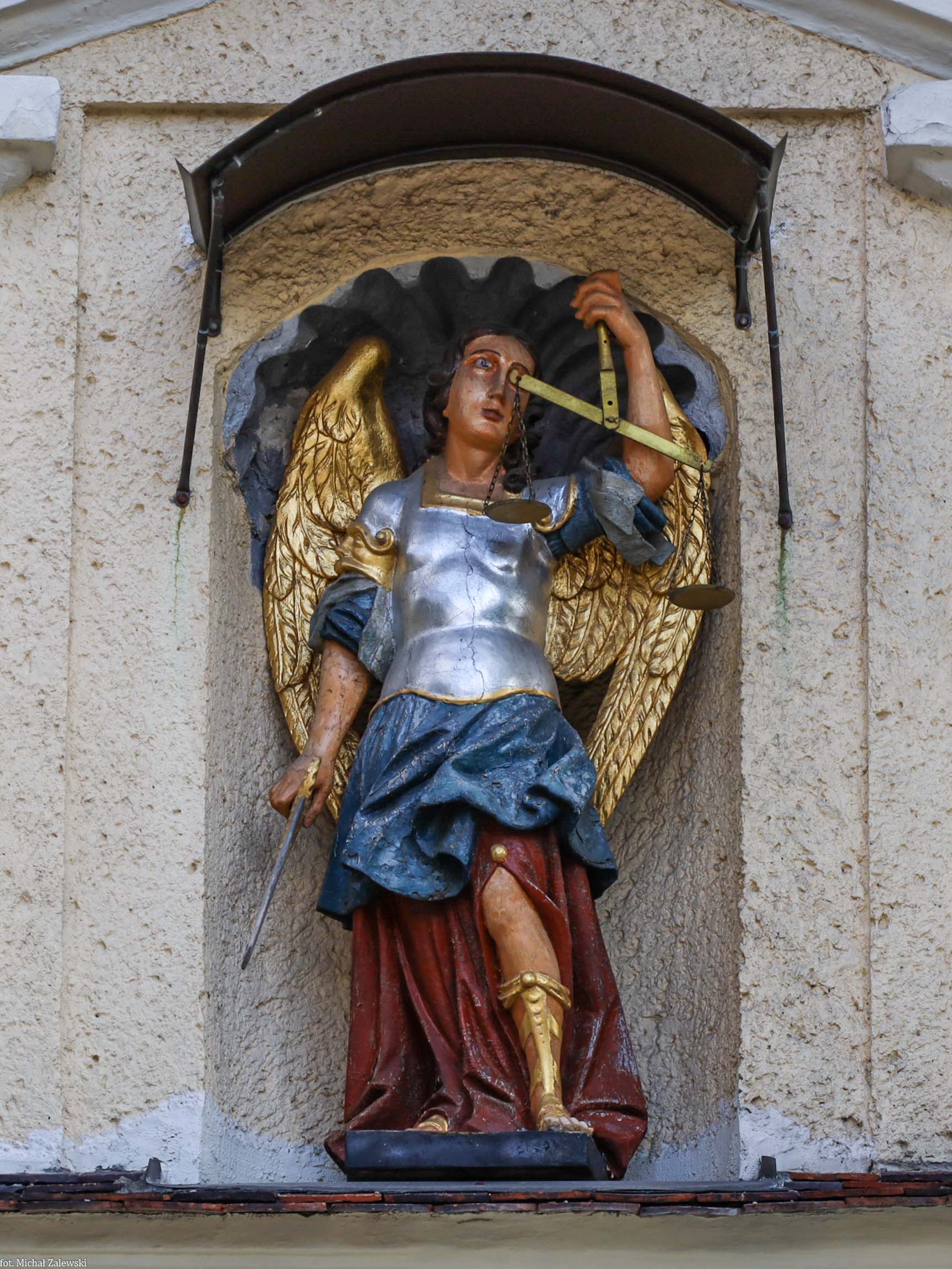 Barokowy Archanioł Michał w bramie na cmentarz kościelny kościoła św. Michała w Nowej Soli. Fot. 2024.