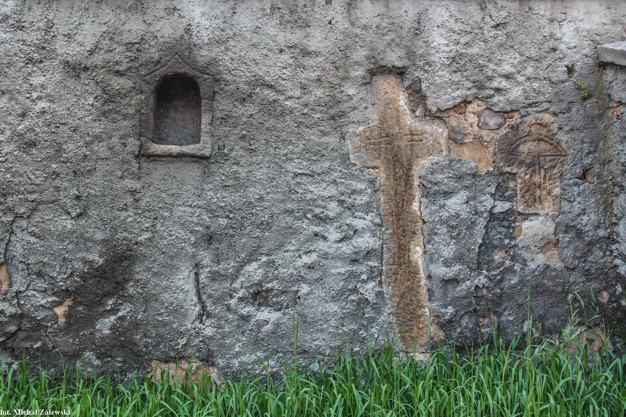Studnica gm. Miłkowice, pow. legnicki. Kapliczka monolitowa w murze cmentarza kościelnego. Południowa strona, od zewnątrz, fot. 2018.