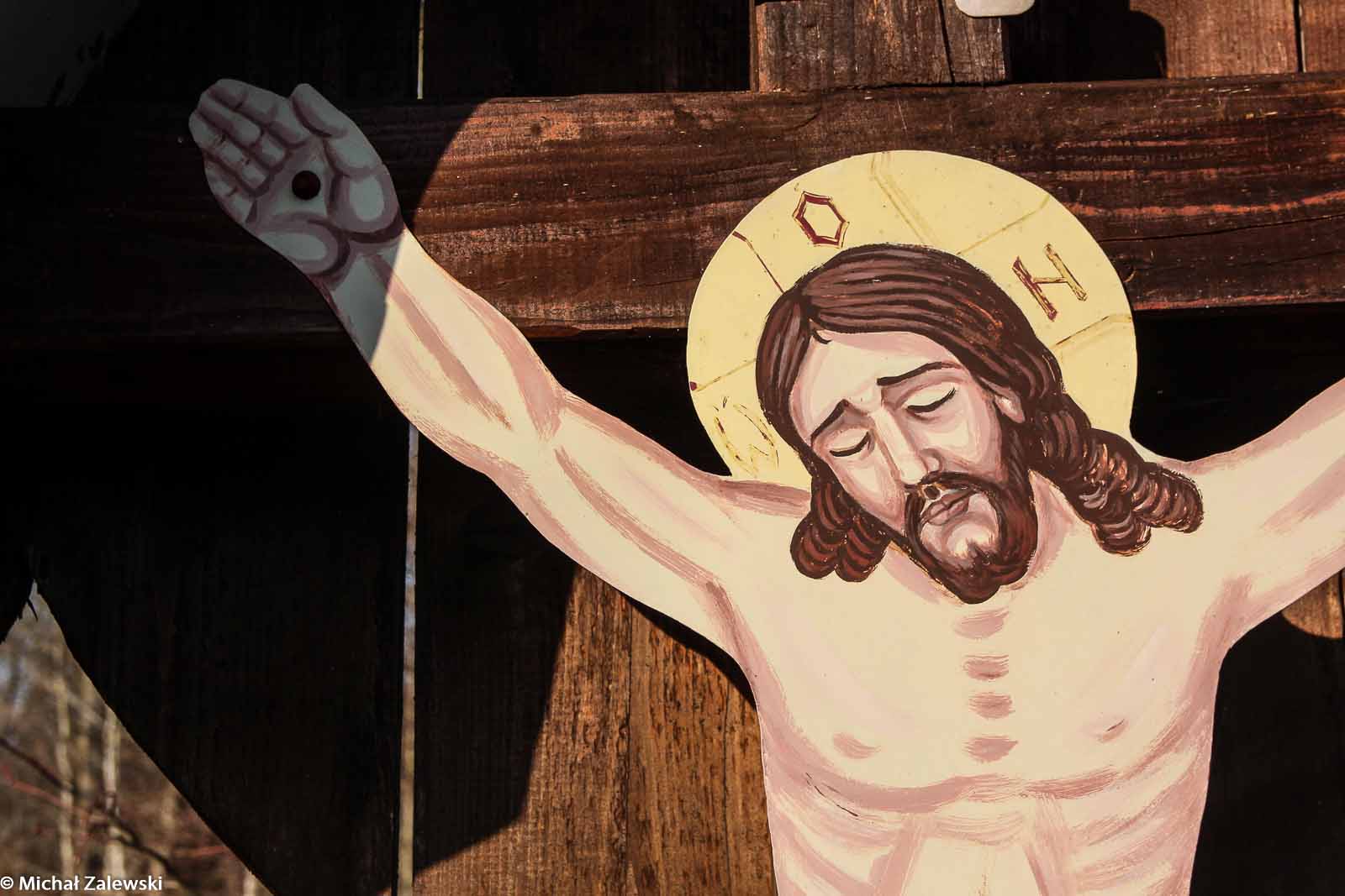 Chrystus z blachy na przydrożnym krzyżu w Nowicy (dodatkowa nazwa w języku. łemkowskim Нoвиця, transkrypcja Nowycia), gm. Uście Gorlickie (fot. 2019)