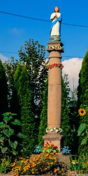 Kolumna w typie toskańskim ustawiona jest na niskim prostopadłościennym cokole, stojącym na dużej podstawie na planie kwadratu. Maria przedstawiona jest z rękami złożonymi do modlitwy, co odbiega od "kanonicznego" wizerunku Niepokalanie Poczętej z lekko rozłożonymi, opuszczonymi ku dołowi rękami i dłońmi zwróconymi wewnętrzną stroną do przodu[3]. Ma odkrytą głowę i włosy opadające na ramiona i plecy, co także różni się od podstawowego typu ikonograficznego, w którym głowę okrywa chusta[3]. W takiej formie Immaculata występuje dosyć często w Małopolsce, również w twórczości cechowych warsztatów rzemieślniczych, których wytwory były wzorem dla ludowych kamieniarzy. Zgodnie z ikonografią stoi na spłaszczonej kuli ziemskiej, oplatanej przez węża, trzymającego w paszczy jabłko. Głowa węża znajduje się pod prawą stopą Marii, a pod lewą umieszczony jest półksiężyc. To również spotykane w Małopolsce odstępstwo od klasycznego przedstawienia, w którym wzniesione ku górze rogi księżyca rozchodzą się po bokach kuli ziemskiej.
