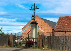 W dużej wsi znajduje się jeden krzyż przy głównej ulicy Wrocławskiej, w okolicy jej skrzyżowania z małą uliczką Cichą. Sytuacja dosyć typowa dla wsi dolnośląskich zamieszkanych przed II wojną światową głównie przez protestantów, którzy nie stawiali krzyży ani kapliczek przydrożnych. Nowi mieszkańcy najczęściej zadowalali się fundowaniem jednego krzyża w centralnym punkcie wsi, rzadko pojawia się jakaś kapliczka. Tak więc do tej pory bardzo łatwo jest odczytać historyczny, mocno przemieszany, religijny krajobraz Dolnego Śląska, ukształtowany podczas nasilenia kontrreformacji po wojnie trzydziestoletniej i trwający do 1945 r.