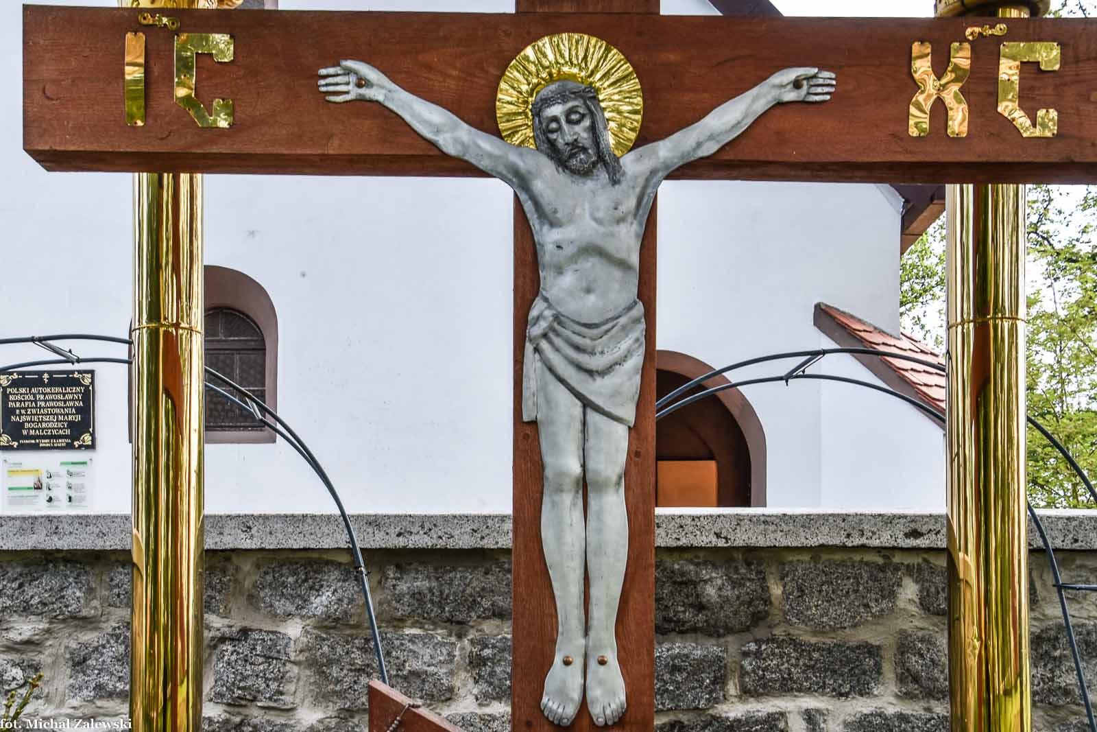 Malczyce (niem. Maltsch, zaraz po II wojnie światowej Małoszyn) pow. średzki, woj. dolnośląskie. Współczesny Chrystus z blachy koło cerkwi Zwiastowania Przenajświętszej Bogurodzicy (dawny kościół ewangelicki), fot. 2019.