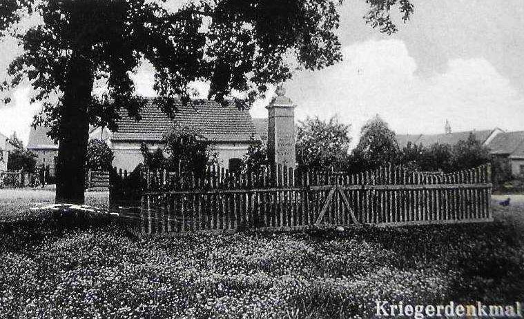 Pomnik upamiętniający żołnierzy, mieszkańców wsi, poległych podczas I wojny światowej (Kriegerdenkmal) w Nadolicach Wielkich. Fragment pocztówki z 1938 r.