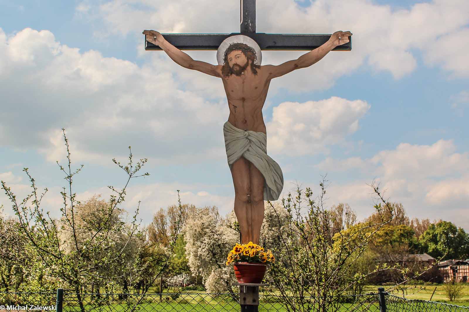 Sadowice (Sadewitz) gm. Kąty Wrocławskie, pow. wrocławski, woj. dolnośląskie. Krzyż przydrożny z blaszanym Jezusem Chrystusem (fot. 2016).