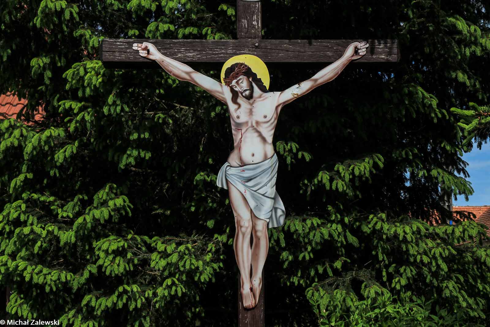 Sokolniki (Klein Sägewitz) gm. Kąty Wrocławskie, pow. wrocławski, woj. dolnośląskie. Krzyż przydrożny z blaszanym Jezusem Chrystusem (fot. 2016).