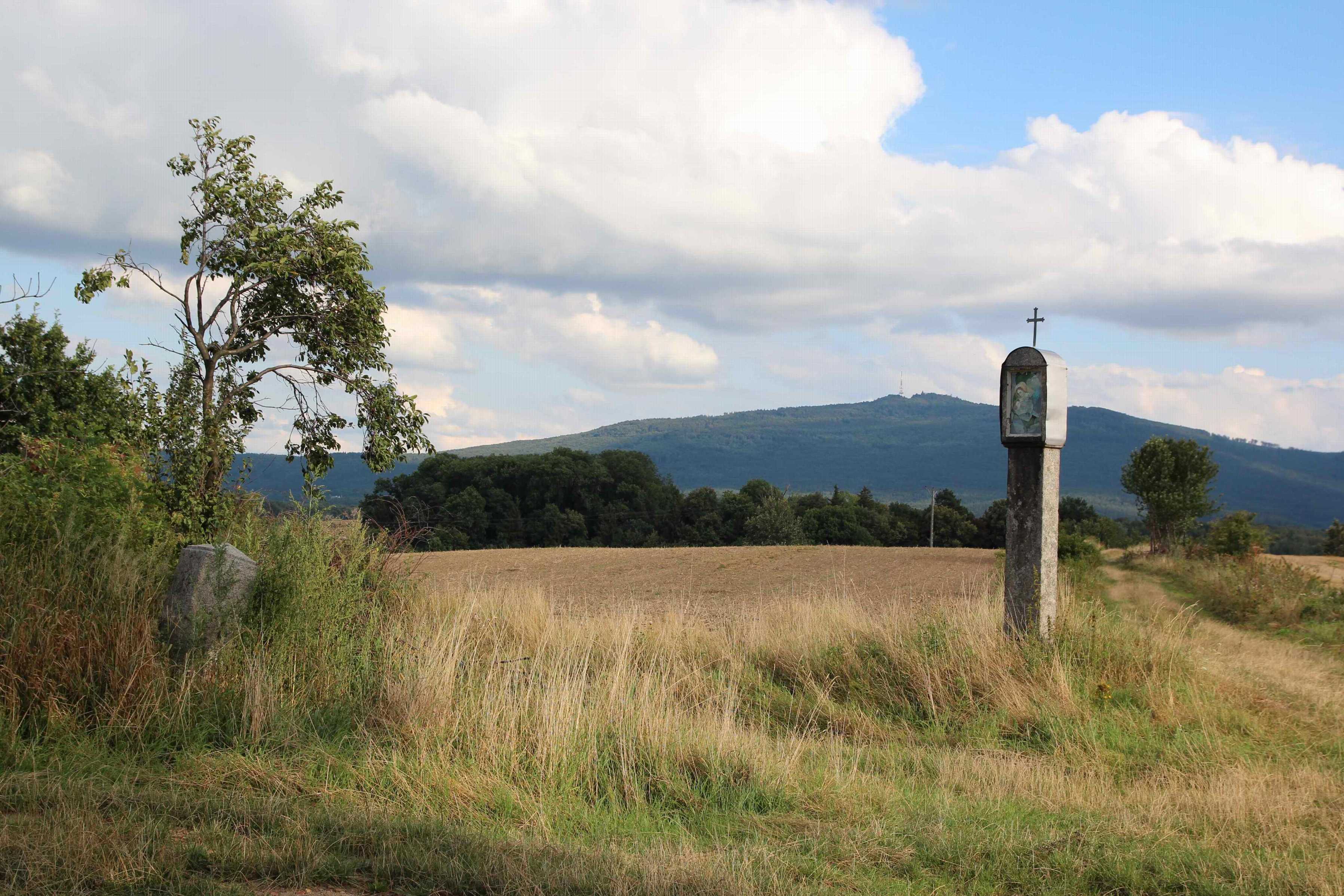 Strzelce gm. Marcinowice, pow. świdnicki, granitowa monolitowa kapliczka słupowa przy polnej drodze do Goli Świdnickiej (2012).