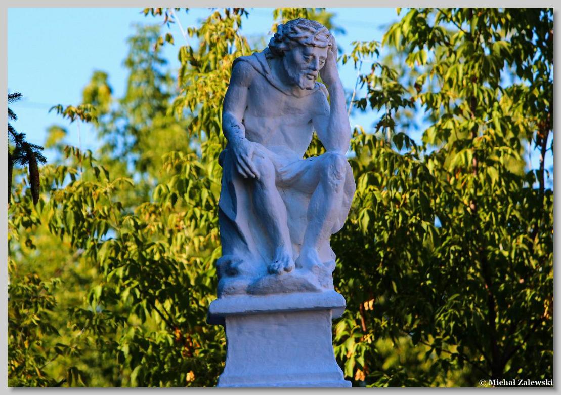 Figura Chrystusa Frasobliwego z 1790 r., wykonana z charakterystycznego dla Ponidzia surowca - wapienia pińczowskiego zwanego pińczakiem.