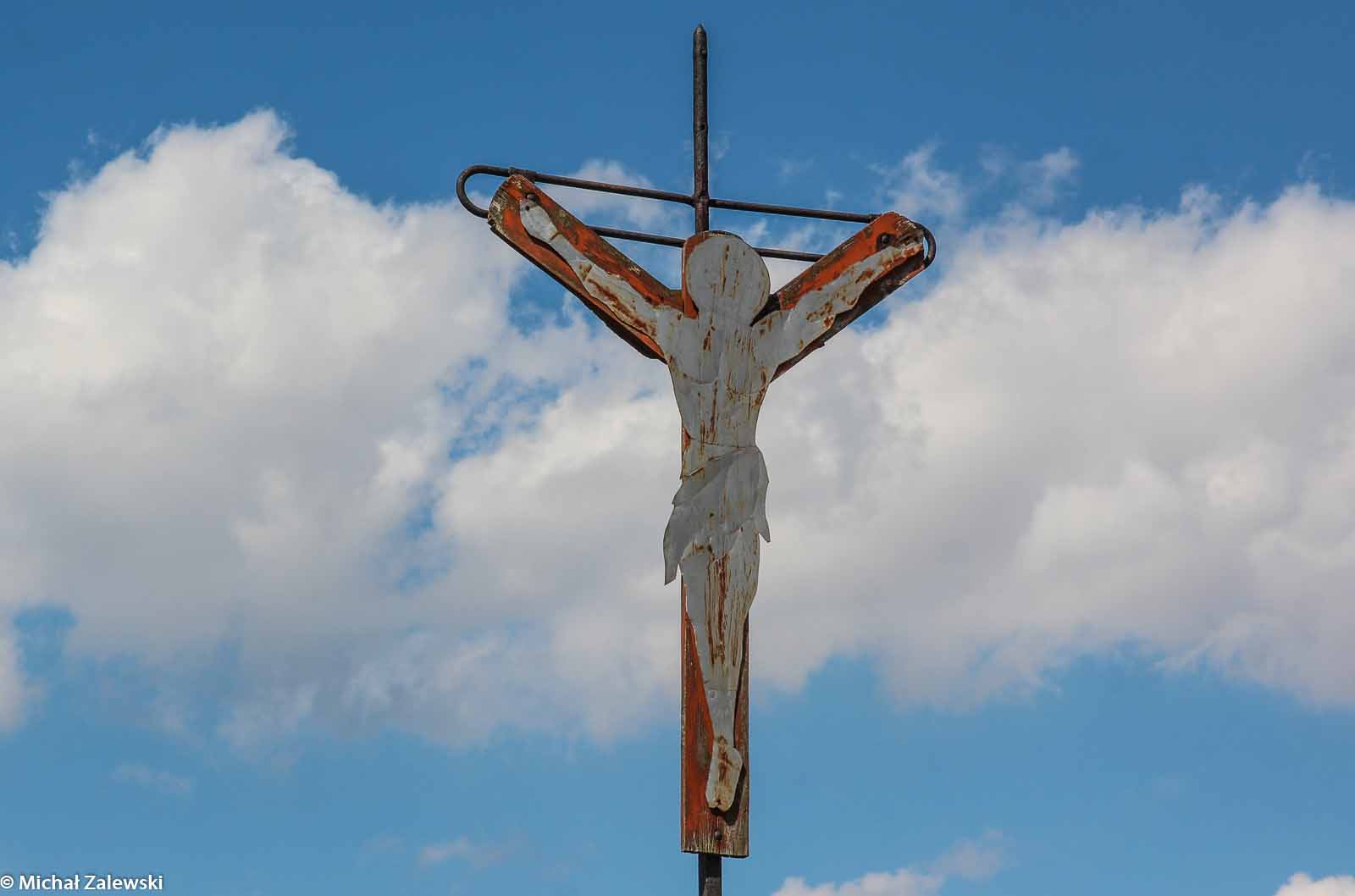 Krzyż przydrożny z Ukrzyżowanym wyciętym z blachy w Zawidowicach (niem. Sadewitz) gm. Bierutów, pow. oleśnicki, przy boisku na wyjeździe na Bierutów (fot. 2016).