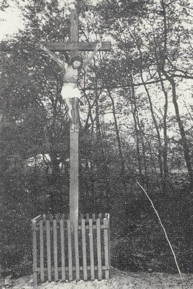 Werynia gm. Kolbuszowa, pow. kolbuszowski. Krzyż z Chrystusem z blachy. Fotografia nr 427 z książki Kapliczki, figury i krzyże przydrożne na terenie diecezji tarnowskiej; ilustracje. Kraków: Nakładem Kurii Diecezjalnej w Tarnowie, 1983.