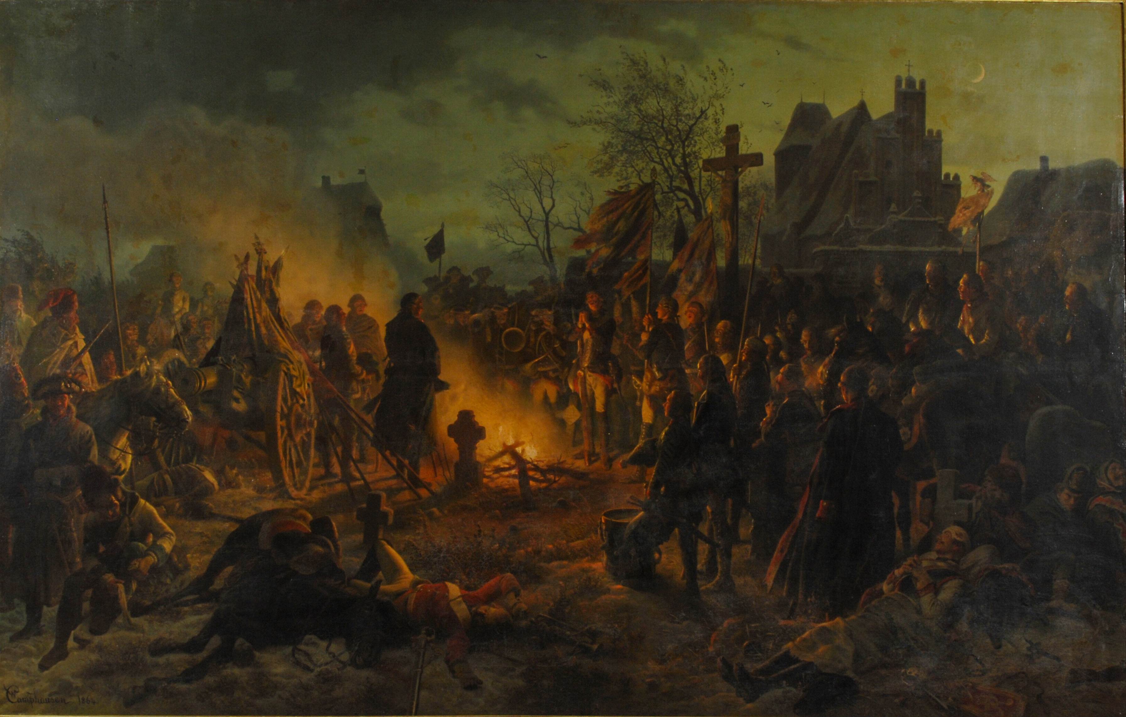 Camphausen pozostawia legendarną scenę, mającą odbywać się na cmentarzu w Lutyni. Żołnierze z różnych jednostek zebrali się wokół ogniska. Na pierwszym planie po lewej huzarzy pilnują jeńców austriackich, a obok nich - między płytami nagrobnymi - leży martwy kawalerzysta obok padłego konia, po prawej kilku rannych. Od Camphausena dowiadujemy się, że mężczyzna pokazany ukośnie od tyłu, stojący w wojskowym płaszczu z założonymi rękami bezpośrednio przy ogniu, za nim zdobyte sztandary wroga oparte są są o armatę, to pruski kapitan (a później feldmarszałek) Wichard Joachim Heinrich von Möllendorf. Odważne zachowanie Möllendorfa podczas bitwy przyczyniło się do zwycięstwa, za co otrzymał od Fryderyka II order Pour le Mérite.